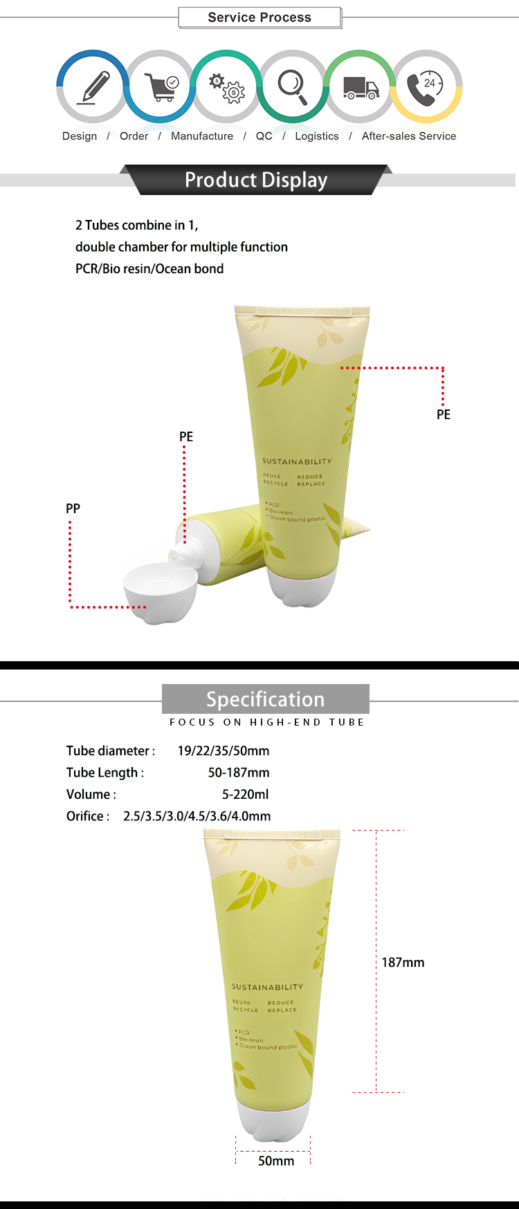 Can be used for facial cleanser, hair removal cream, body lotion cosmetic packaging tube plastic tube. Material options for cap and sleeve:PCR, Bio-Resin or Ocean bound plastic. We use environmentally friendly materials and follow the 4R concept: Reuse, Reduce, Recycle, Replace.