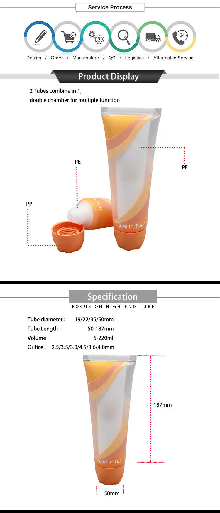 2 Tubes combine in 1, double chamber for multiple function.Our patented Tube In Tube is putting a smaller tube into a bigger tube, filled with two different formulas, it comes out separately but integrating into one. Optional different orifices which makes an artistic effect when squeezing out. The unique design of the flower tube, through the flower-shaped tube mouth design, the emulsion is flower-shaped after extrusion, which greatly improves the user's experience.