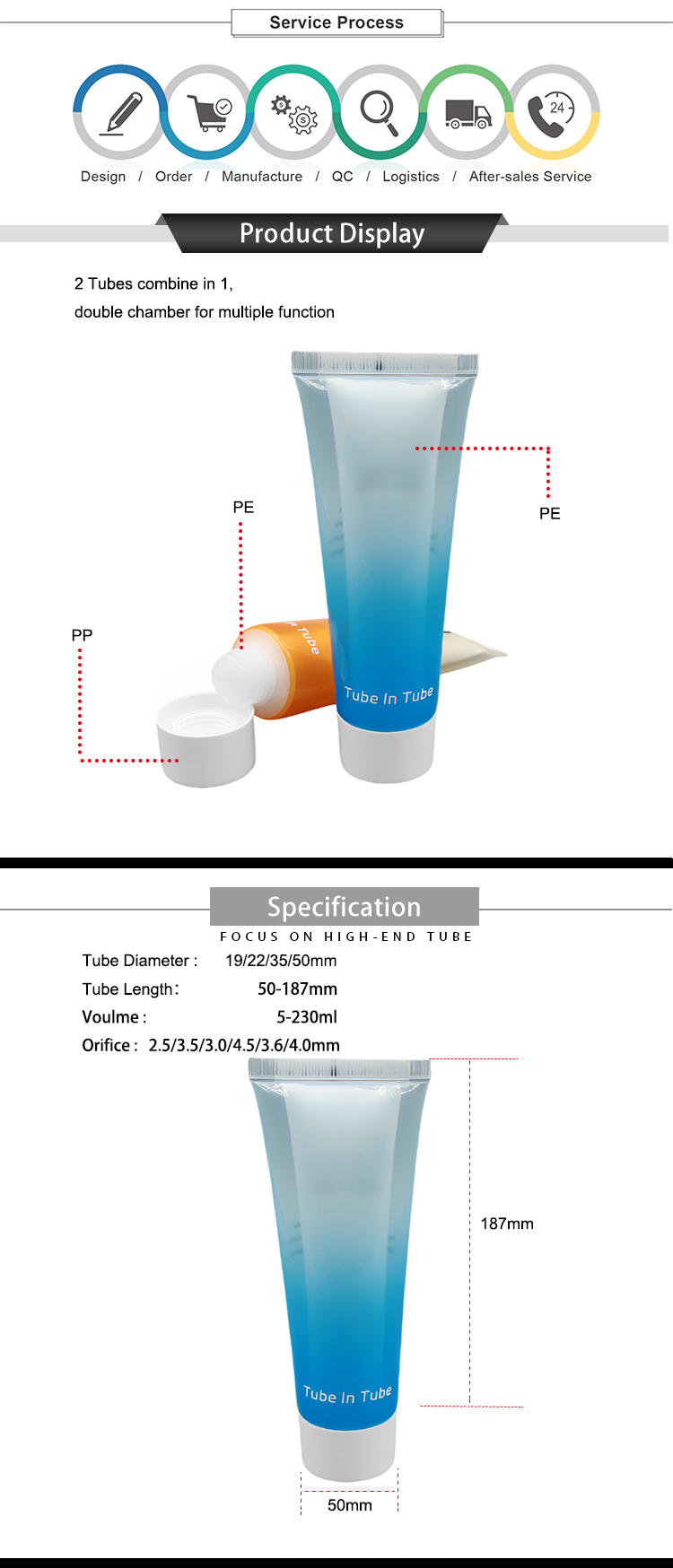 Explore our versatile range of innovative tubes, featuring PE twin chambers for body cream, dual color designs for facial cleansers, plastic double tubes with dual chambers, 2 in 1 options, and empty shampoo tubes with dual layers for various cosmetic applications. 2 Tubes combine in 1, double chamber for multiple function.Our patented Tube in Tube is putting a smaller tube into a bigger tube, filled with two different formulas,it comes out separately but integrating into one.