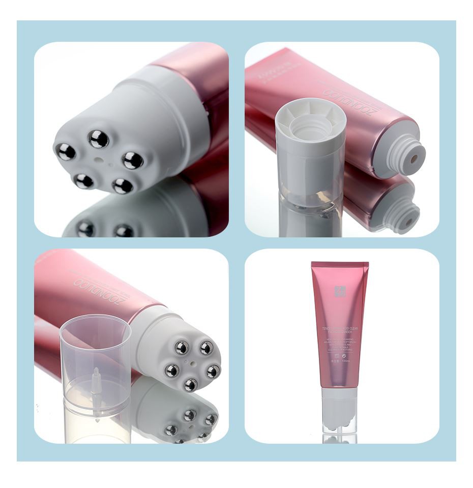 As the photo the plastic tube with 5 balls is a laminated tube with shinny pink color on the whole tube, Diameter of the tube is 40mm, tube length is 135mm. The applicator is massage head with 5 steel balls, the touching surface is bevel, more touching area is added, making the massage application is faster. The formula outlet is at the middle of the applicator, the outlet is thimble sealed by the cap, when the cap is open, the formula flows, when the cap is screwed on, the formula flow locks. With this special on and off way, there is no need to design on and off switch on the applicator.